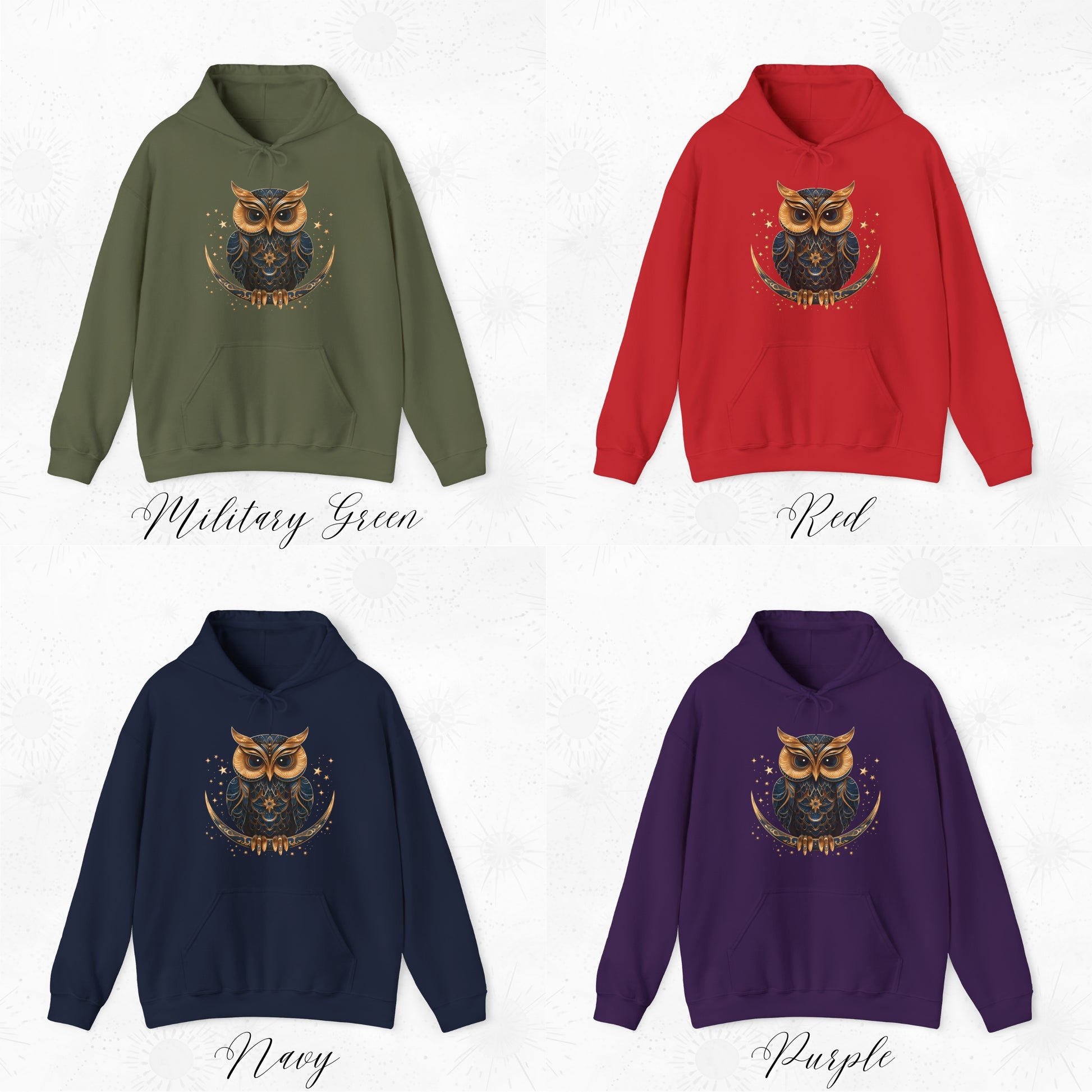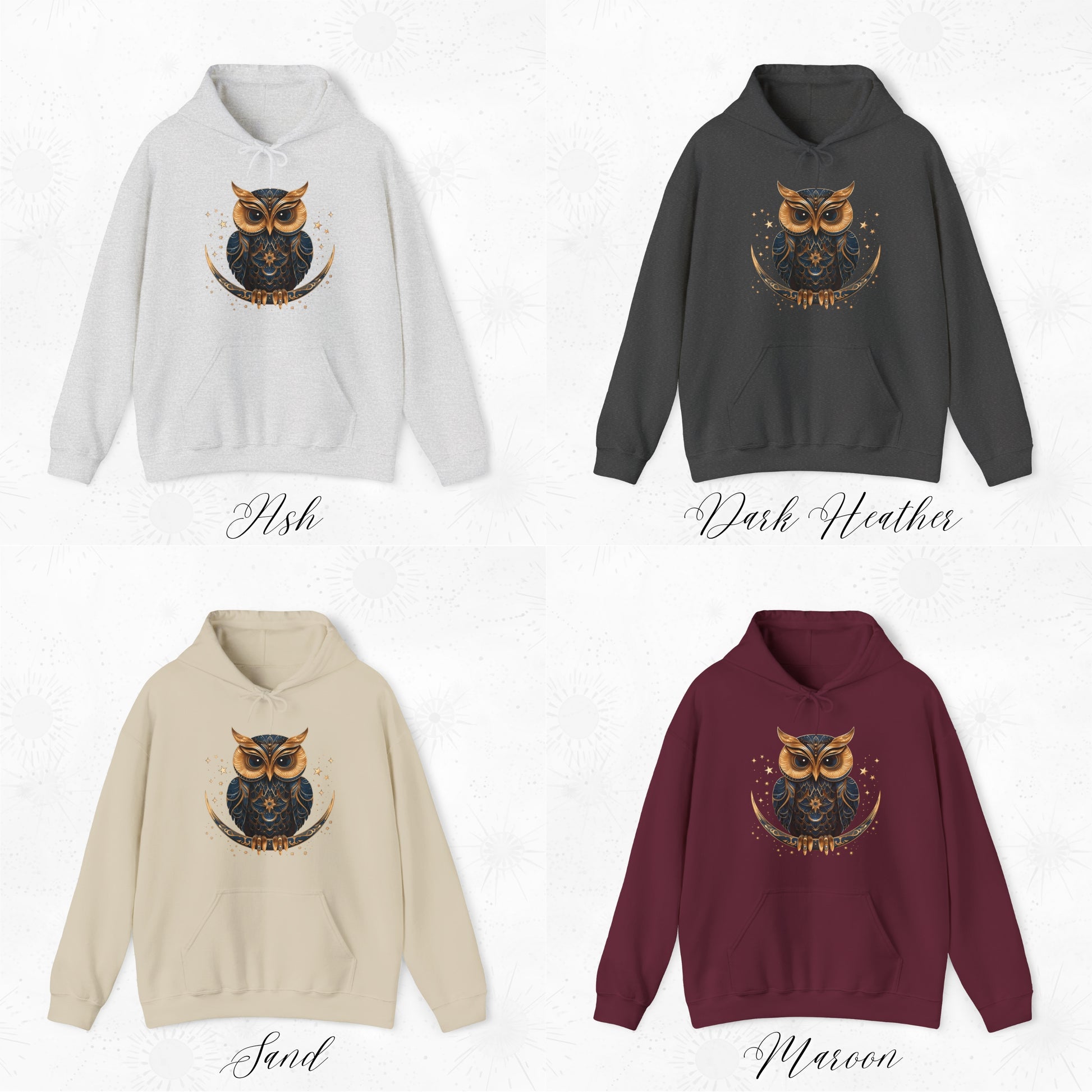 This Moon Owl Hoodie features a bohemian vintage aesthetic owl design, giving off a mystical and free-spirited vibe. Perfect for those who love celestial themes and unique, artistic designs. Ideal for cozy nights and casual outings. This hoodie makes a wonderful gift for an owl lover at Christmas or birthday.
