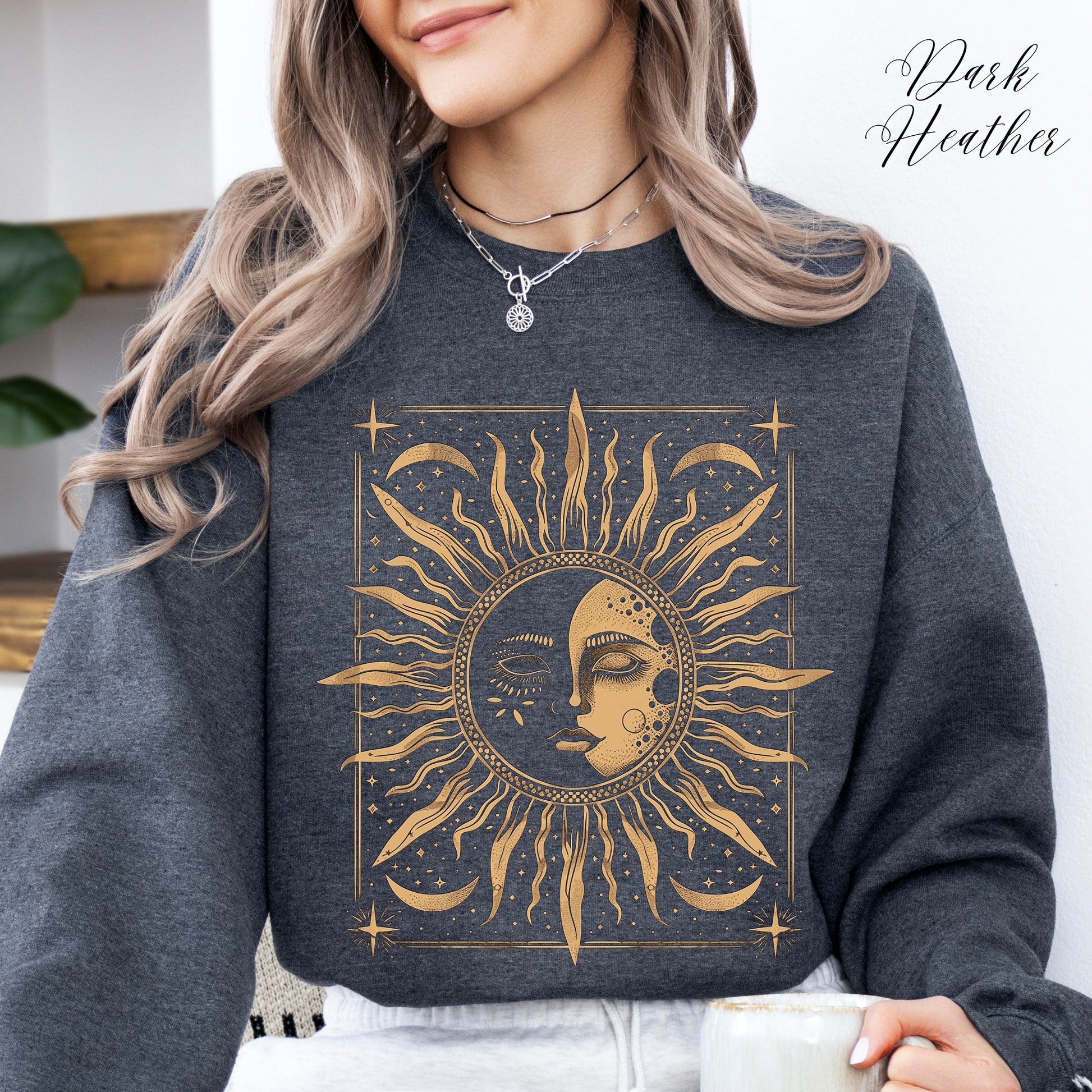 Embrace the boho vibes with this Sun and Moon Phase Sweatshirt. Ideal for adults who love a bohemian and hippie aesthetic, this jumper is perfect for festivals, casual outings, and beach days.