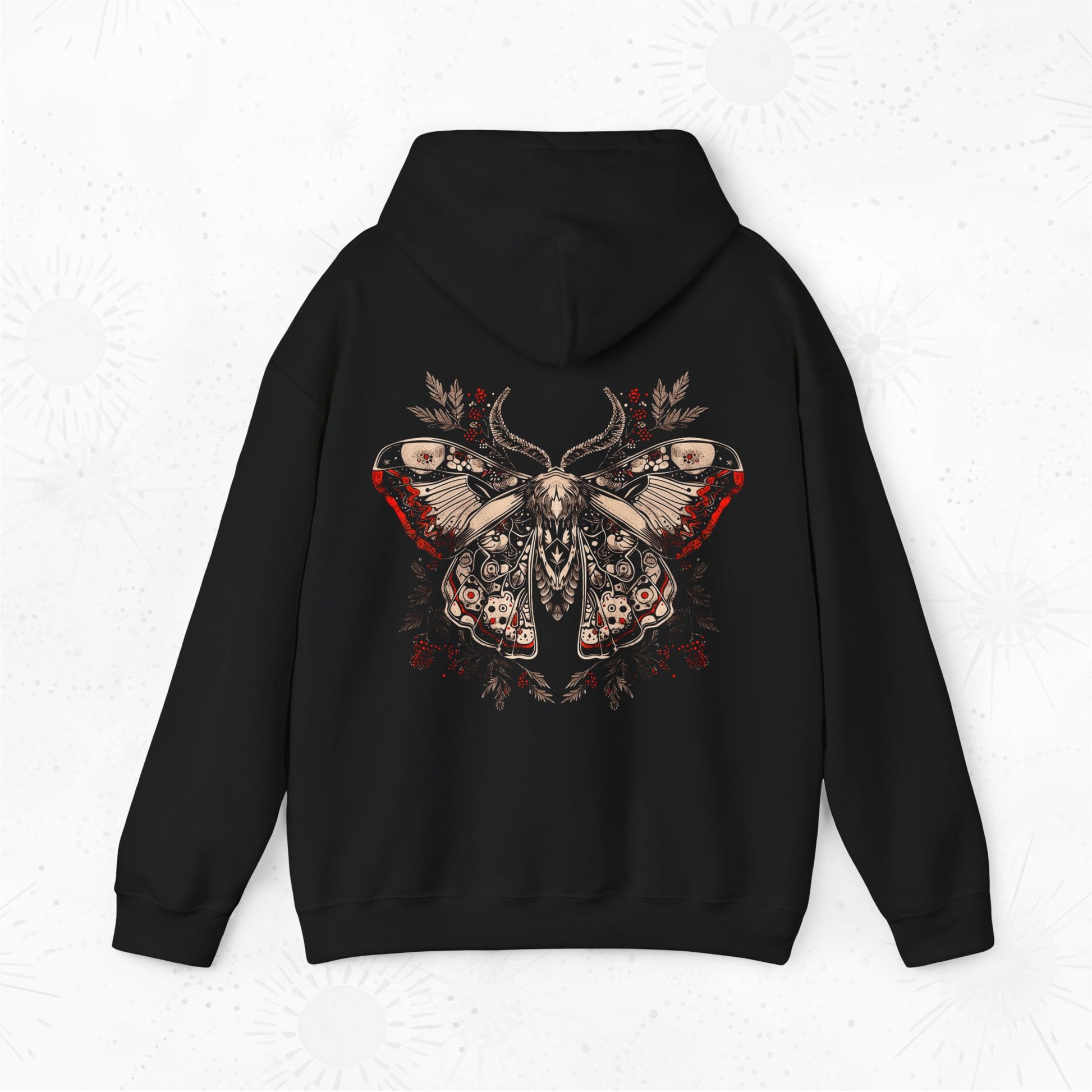 Channel night energy with this Norwegian Gothic Moth hoodie. An essential for gothic, occult, and alternative fashion lovers. Inspired by Norwegian folklore and dark aesthetics.