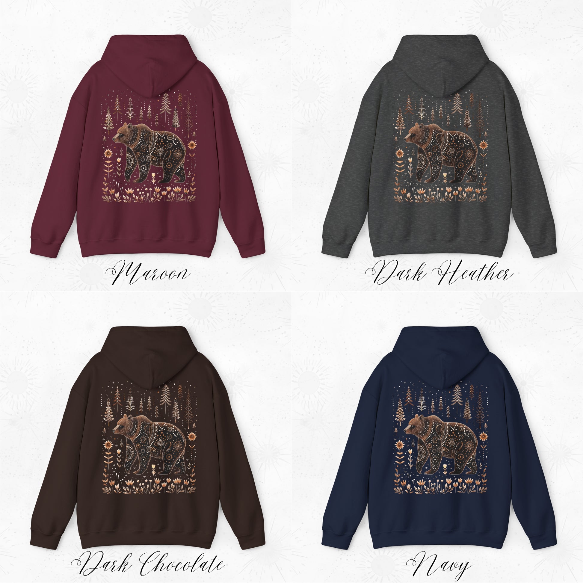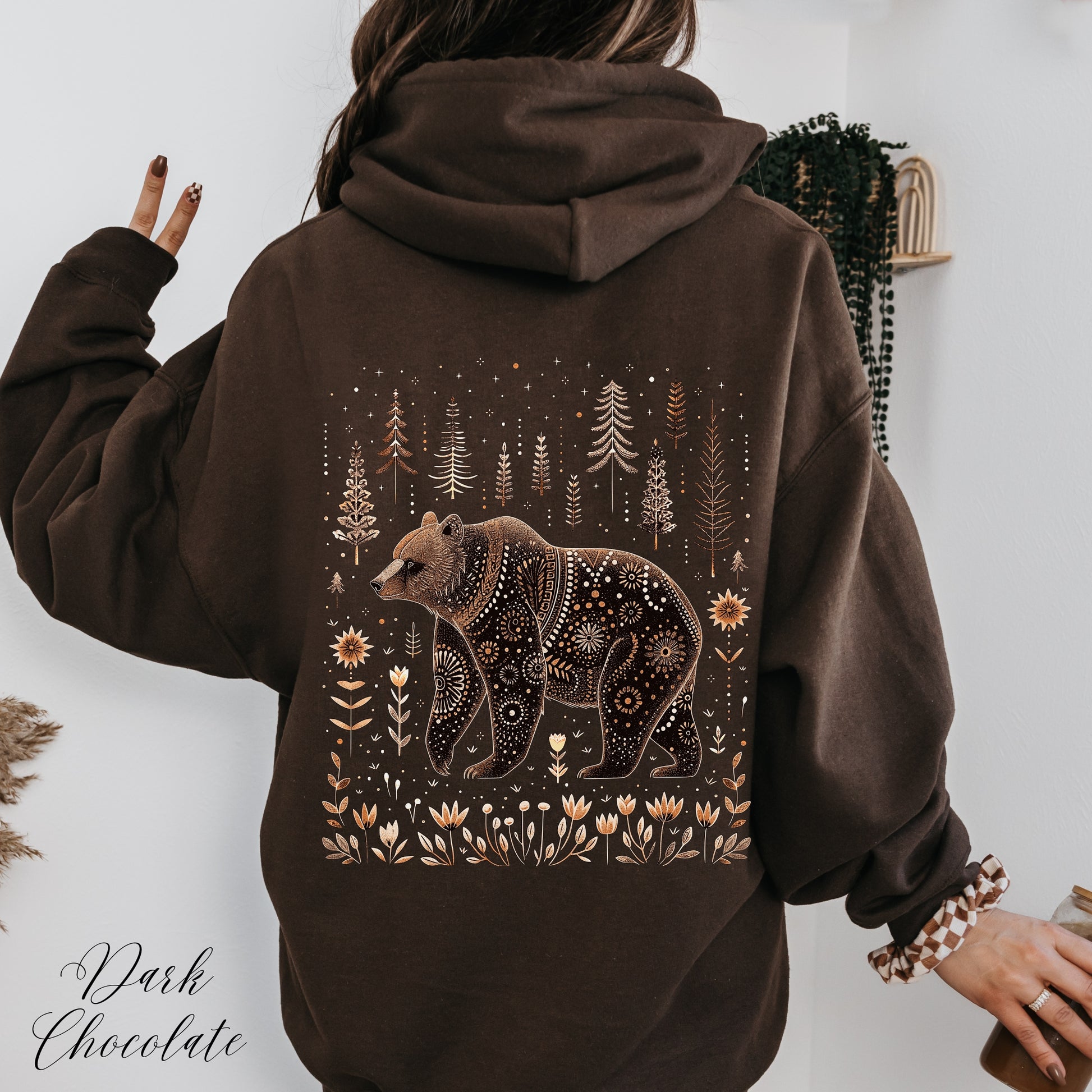 This Scandinavian Bear Hoodie with a bohemian Cottagecore design gives off a cozy and rustic vibe. Perfect for those who appreciate unique and artistic clothing. Ideal for winter holidays, cozy nights by the fire, and outdoor adventures.