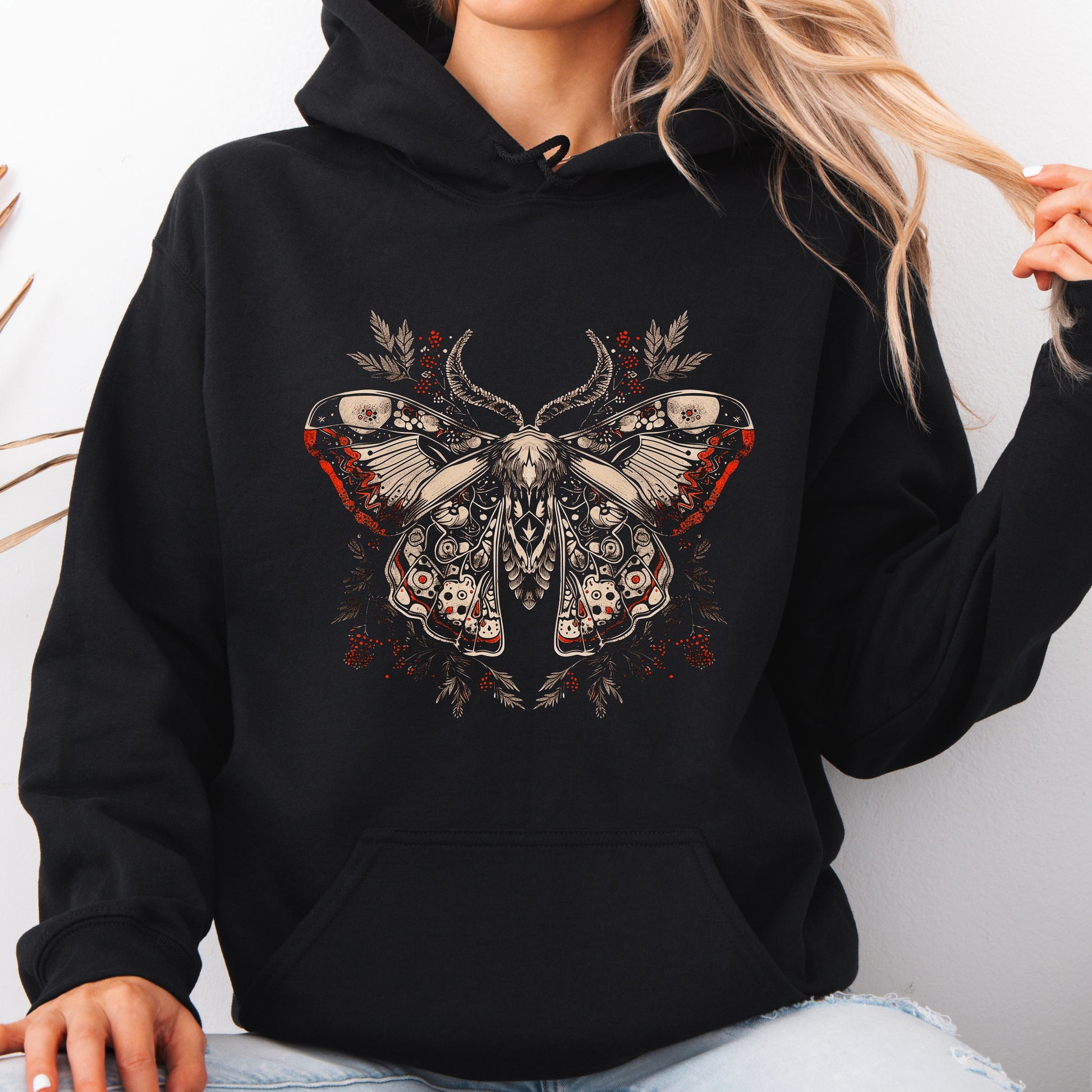 This Norwegian Moth Hoodie combines gothic and Scandinavian aesthetics. A versatile piece for witchy and mystical wardrobes. A must-have for lovers of dark and alternative fashion.